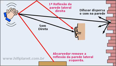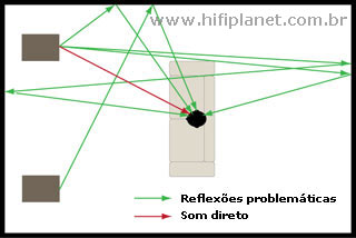 Quando o som deixa as caixas acústicas, uma parte dele se dirige direto ao ouvinte, e outra parte é refletida na sala, pois o som não sai como um foco de luz de uma lanterna direcional, ele se espalha no ambiente, refletindo pelos objetos, paredes, teto, etc., ou sendo absorvido por estes. Pode ocorrer ainda o “espalhamento” da onda sonora em diversas outras que são refletidas de modo desordenado.